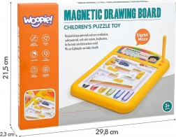 A WOOPIE mágneses tábla szórakoztató és oktató eszköz, amely támogatja az önálló felfedezést és a koncentrációt. A mágneses íróval a gyermek a rejtett fém golyókat a felszínre emeli, és formákat, mintákat rak ki belőlük. A golyók biztonságosan a táblán belül vannak rögzítve, így nincs rendetlenség és nem vesznek el az elemek.