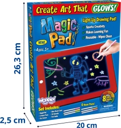 A WOOPIE márkájú varázslatos rajztábla a gyerekrajzokat világító, neon alkotásokká változtatja. A 8 fényhatású LED háttérvilágításnak, a törölhető felületnek és a neon filceknek köszönhetően a rajzolás, a betűtanulás és a számolás tiszta, szórakoztató és maximálisan kreatív.