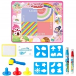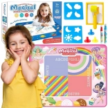 Fedezze fel az okos alkotást egy csepp festék nélkül. A szőnyeg vízzel tölthető filceket használ, amelyek a speciális felületen színes nyomot hagynak, ami rövid idő után magától megszárad és eltűnik. A 100 × 80 cm-es méretnek köszönhetően bőven van hely akár két kis művész számára is. A könnyű és összecsukható kivitel egyszerű hordozást és tárolást biztosít.