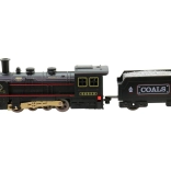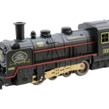 A fekete mozdony piros és arany díszítéssel, kéménnyel és feltűnő kerekekkel igazi vasúti hangulatot ad minden utazásnak.
