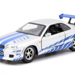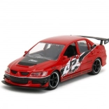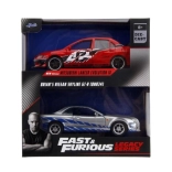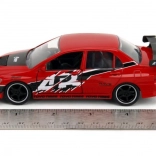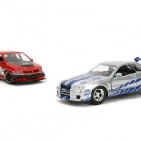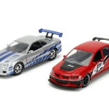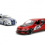 Ez a prémium dupla csomag ikonikus filmes autókat hoz el igényes kidolgozással: piros Lancer Evo IX verseny grafikákkal és feltűnő szárnnyal, valamint ezüst Skyline GT‑R R34 kék csíkokkal. A fém karosszéria, realisztikus részletek és a funkcionális ajtók fokozzák a gyűjtői és a játékélményt.