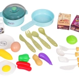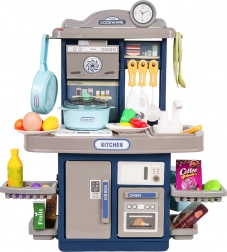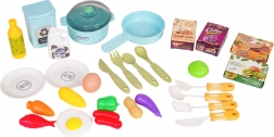 Edény, serpenyő, eszközök, tányérok és élelmiszer-utánzatok egészítik ki a sütőt és az „ice box”-ot. A kampók és polcok segítenek rendben tartani a konyhát játék közben.