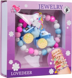 Rugalmas karkötő színes gyöngyökkel és gyöngyszemekkel, egyszarvú medállal. Könnyen felhúzható és kényelmesen illeszkedik a gyermek csuklójára.
