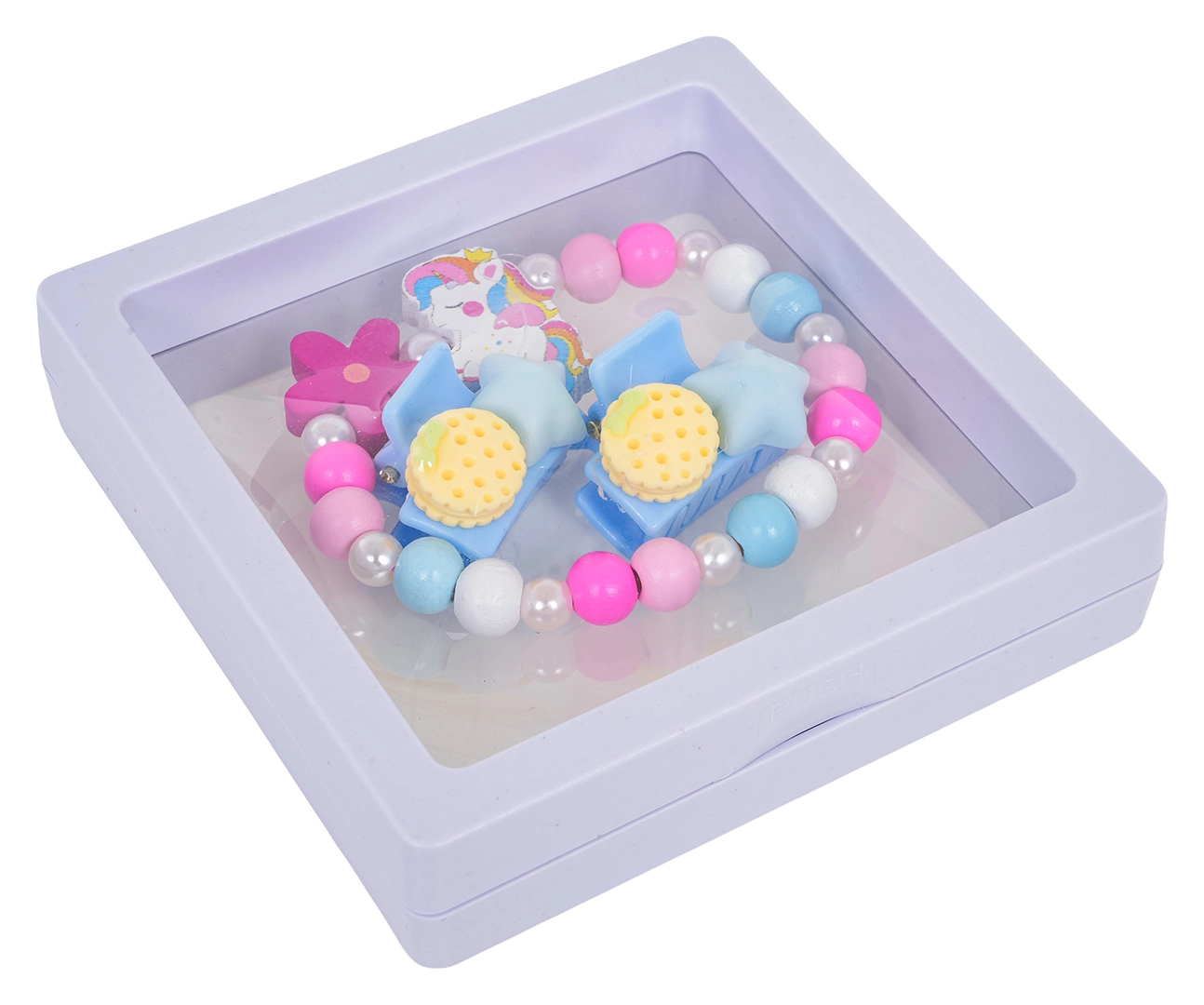 Ez a bájos, egyszarvús motívumú gyermek ékszerszett minden 3 évesnél idősebb kis parádést felvidít. Rugalmas, színes gyöngyökből készült karkötőt és két hajcsatot tartalmaz. A szett aprólékos kidolgozással, élénk színekben készült, és ideális ajándéknak.