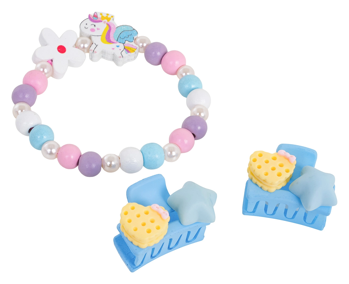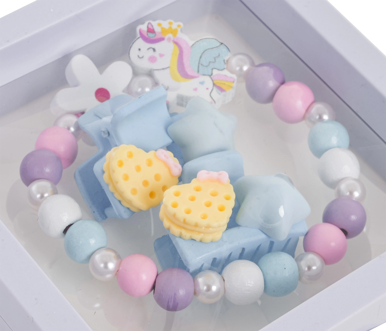Ez a bájos gyermekszett játékos unikornis motívumot, finom színeket és kellemes anyagokat ötvöz. A karkötő színes fa gyöngyökből és gyöngyszemekből készült, amelyeket egy aranyos unikornis medál egészít ki. A két praktikus csat feldob minden frizurát, és támogatja a fantáziadús játékot.