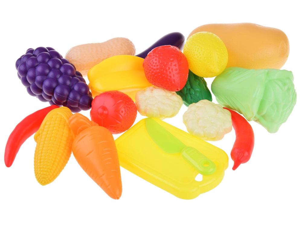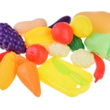A készlet része egy vágódeszka és egy kés a szeletelés biztonságos utánzásához, amely segíti a finommotorika és a koordináció fejlesztését.