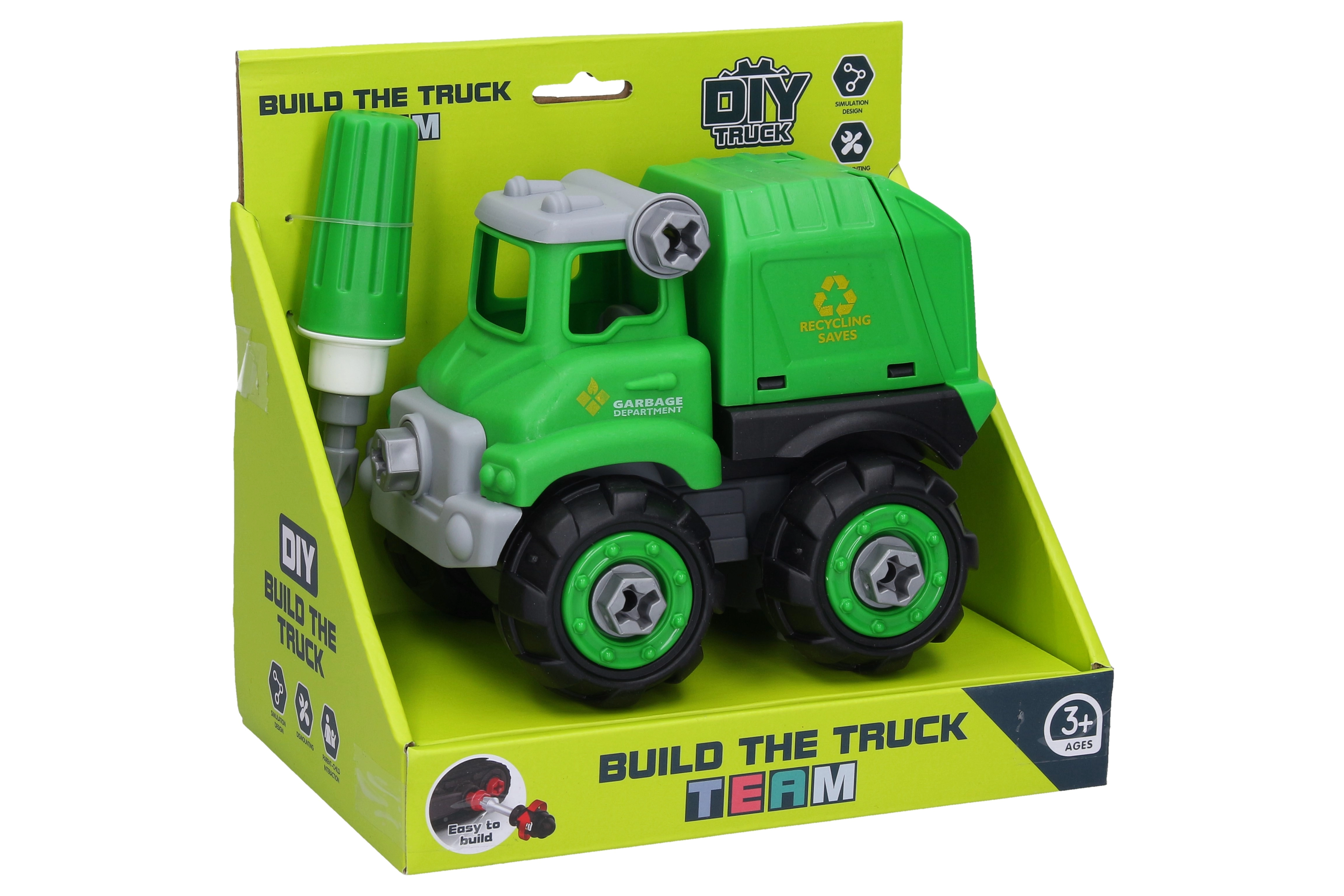 Szórakoztató és egyben tanulságos csavarozható kukásautó 16 cm-es hosszban, amely örömet szerez a kis szerelőknek és az autók rajongóinak. Szabadon futó kerekekkel, felnyitható hátsó ajtóval rendelkezik, a csomagban pedig egy csavarhúzó is található az egyszerű összeszereléshez és szétszereléshez.