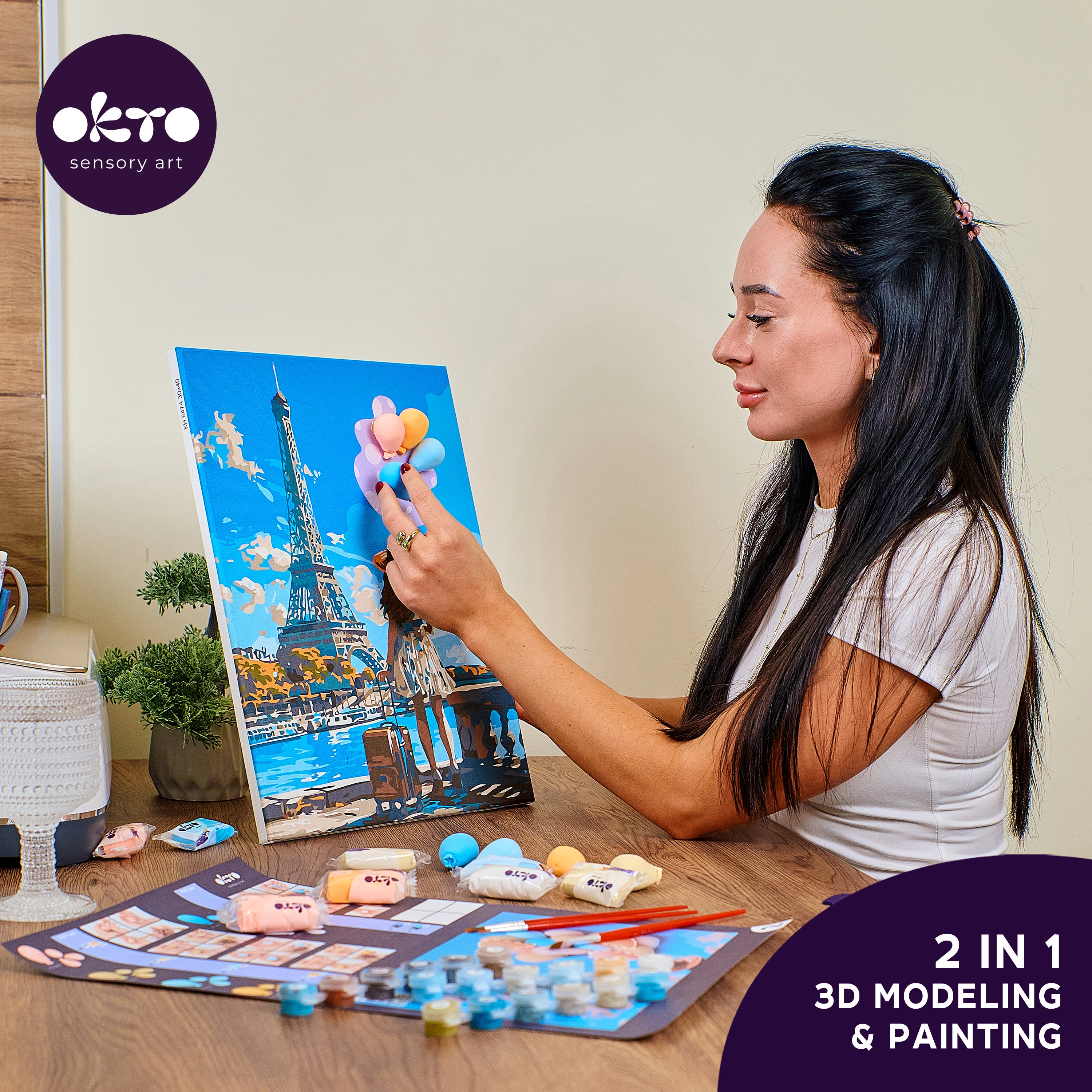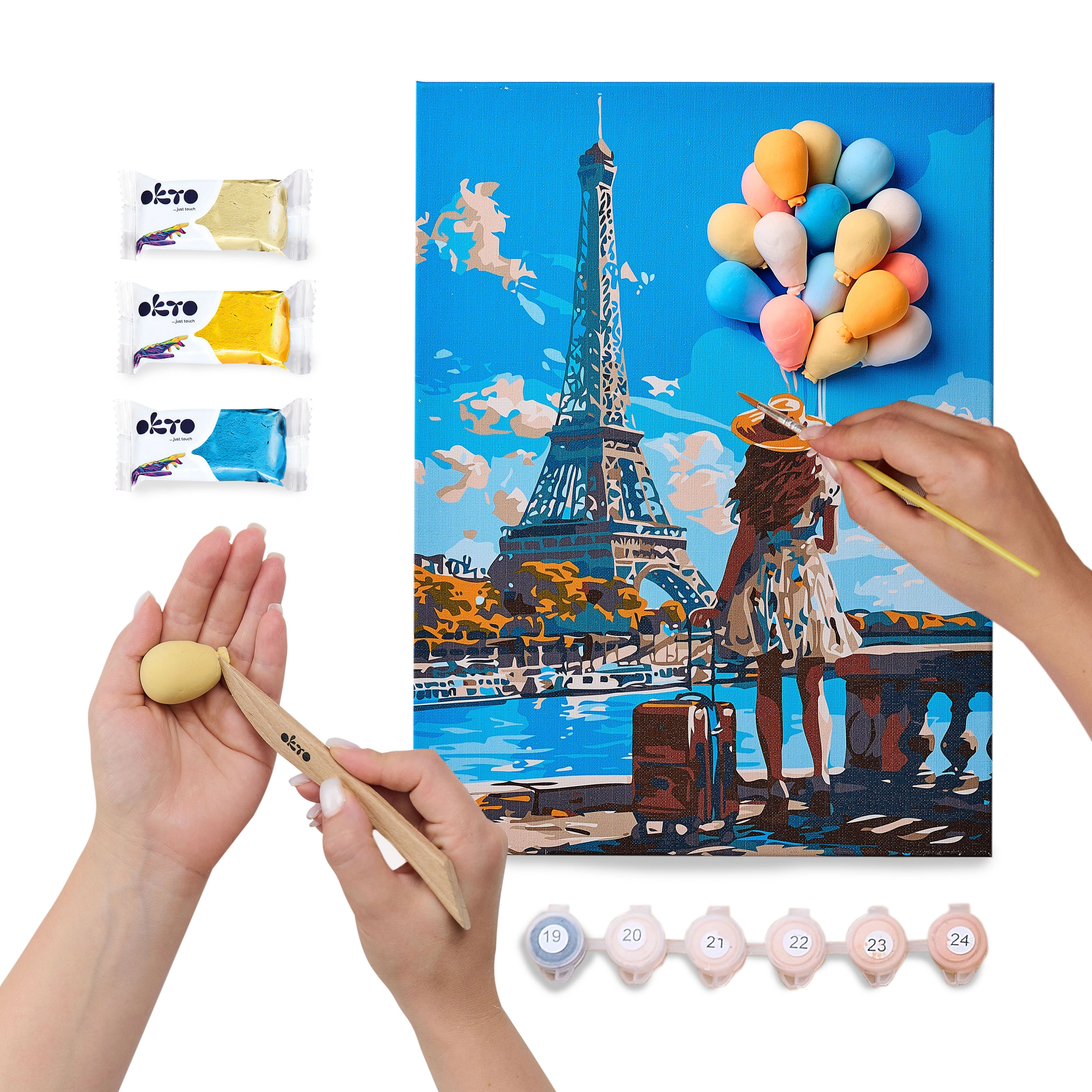 Ez az OKTO kreatív készlet ötvözi a festést a 3D modellezéssel, így otthon egyedi, Párizs témájú képet alkothat. A sablonnak és a lépésről lépésre követhető útmutatónak köszönhetően plasztikus elemeket hoz létre, amelyek mélységet és stílust adnak a képnek. Ajándéknak és lakásdekorációnak is ideális.