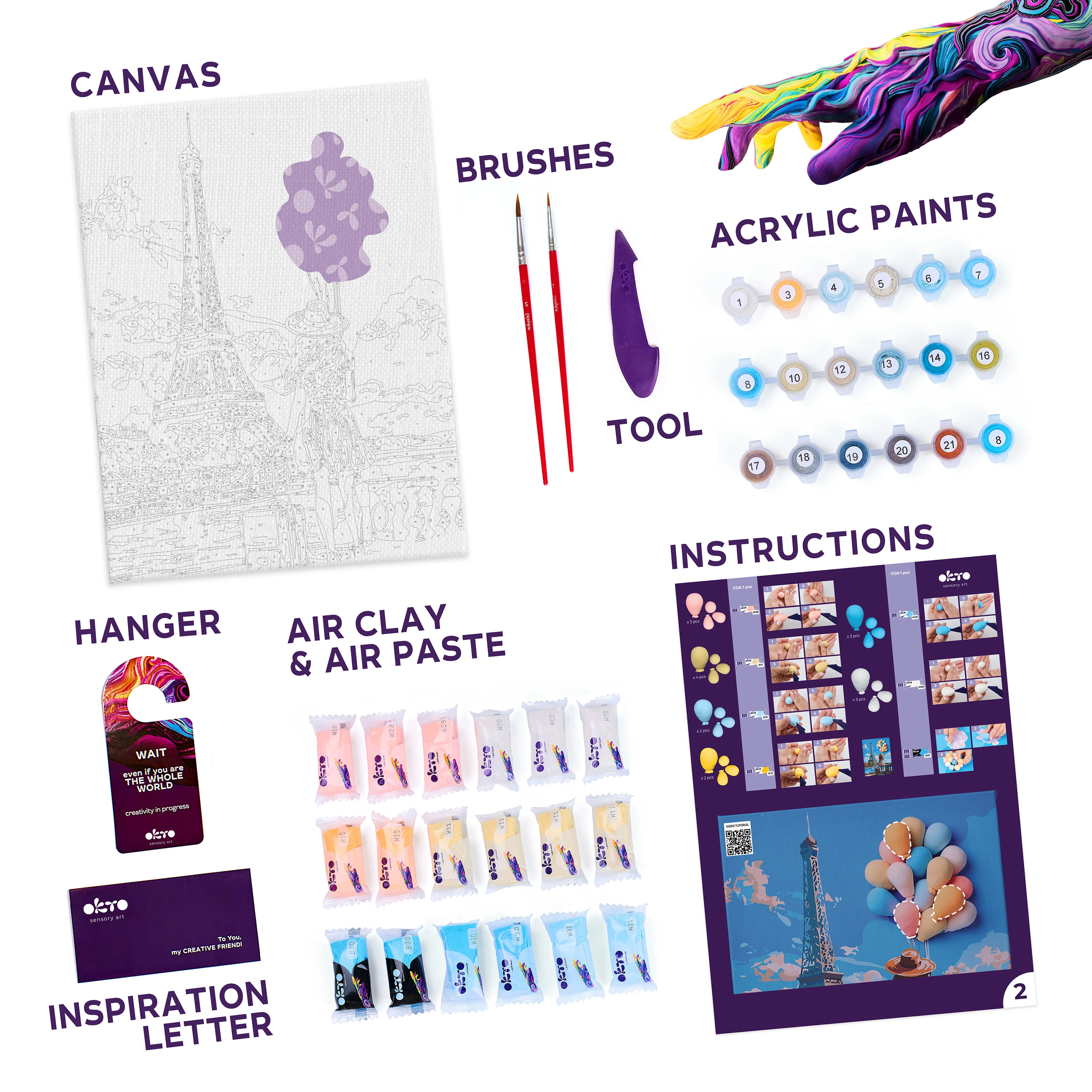 - Teljes készlet: vászon, útmutató, modellező eszköz, légszáraz gyurma, festékek, ecset