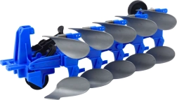 A kék eke sok tárcsával és masszív vonószerkezettel hűen utánozza a szántóföldi munkát.