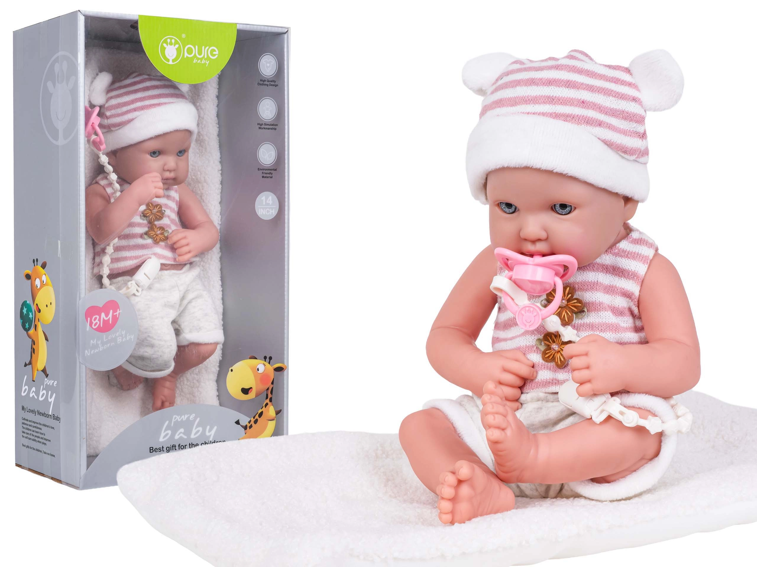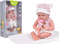 A csomagban minden megtalálható, amire a gyerekeknek szükségük van a játékhoz: zsinóron lévő cumi a baba megnyugtatásához és egy puha takaró a pelenkázáshoz vagy az elalváshoz. A baba 3 éves kortól ajánlott, ruházata kényelmesen levehető (sapka, felső és rövidnadrág), és könnyen tisztán tartható.