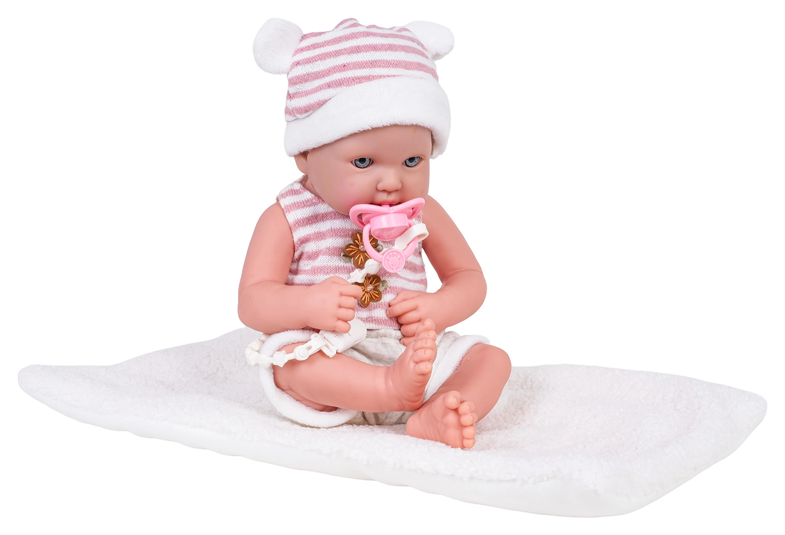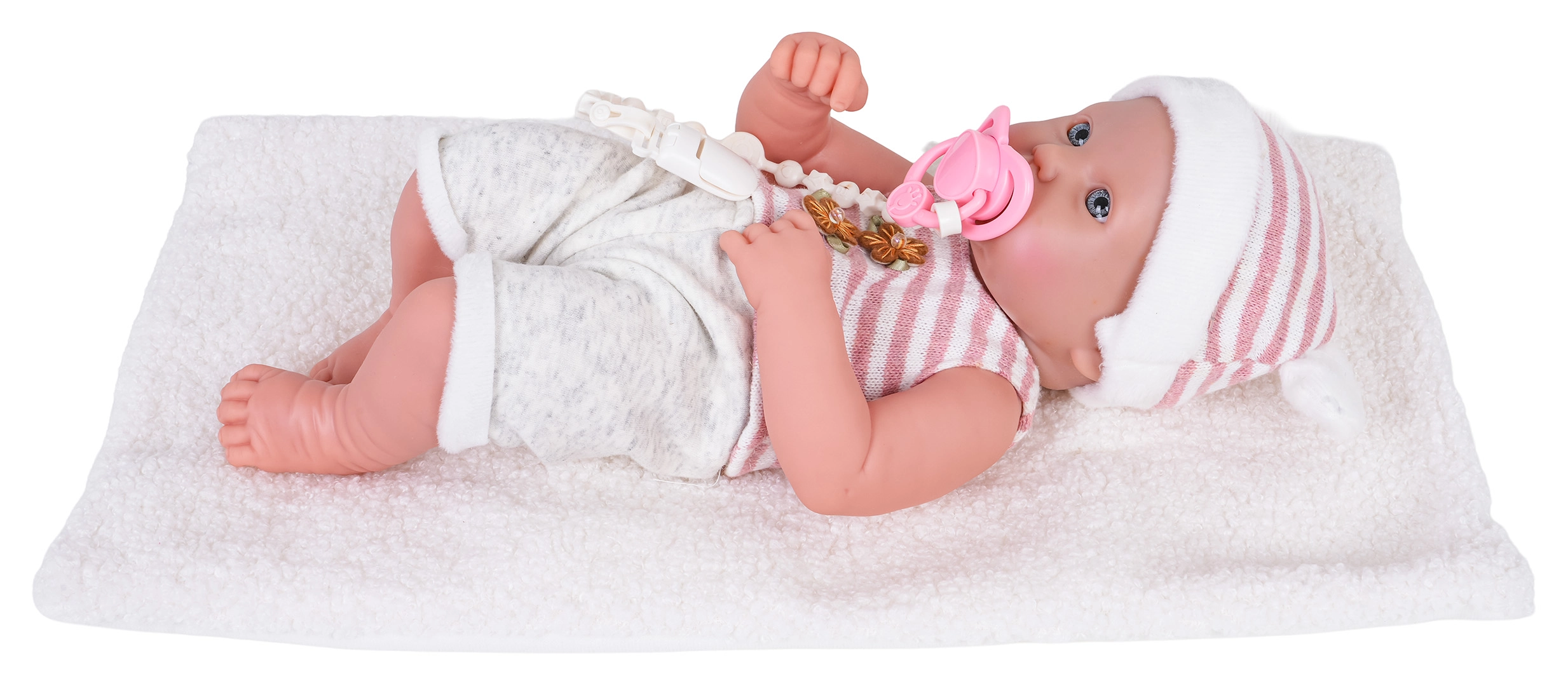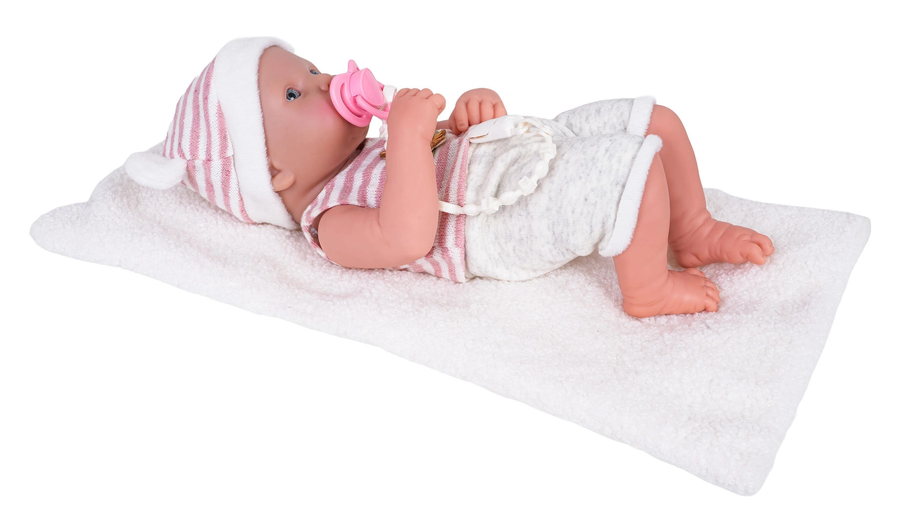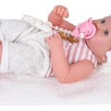 A babának mozgatható karjai és lábai vannak, így a gyerekek le tudják ültetni, betakarni vagy a cumit tartatni vele, mint egy igazi kisbabával.