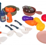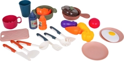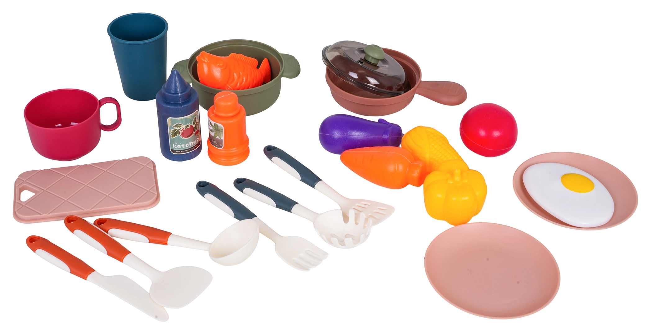 - konyha, serpenyő, fedeles lábas, bögre, füllel ellátott csésze, vágódeszka, 2 × tányér, kés, 2 × lapát/fordítólapát, merőkanál, tésztaszedő kanál, nagy villa, ketchup, bors, játék élelmiszerek: hal, sárga paprika, paradicsom, sárgarépa, padlizsán, kukorica, tükörtojás