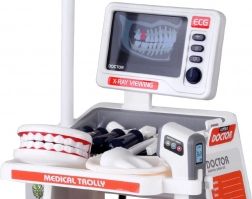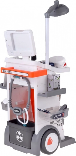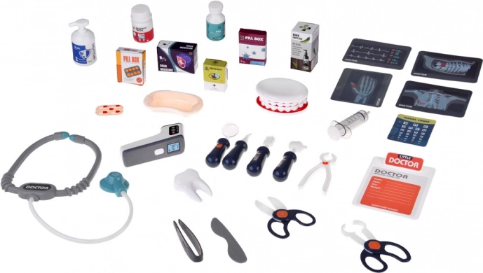 A csomag széles körű tartozékokat tartalmaz: sztetoszkóp, hőmérő, LED-es fogászati tükör, csipeszek, olló, fogkefe, kapszulák, „gyógyszeres” dobozkák, nyitható állkapocsmodell és külön „fog”, EKG-kártya és röntgenlapok. A mobil kialakításnak és a tárolópolcoknak köszönhetően a készlet ideális a közös játékhoz és a rend megtartásához.