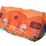 A csomag része egy színes textil ponyva táborozás témájú mintával. Egyszerűen csak ráteríted a szerkezetre, és máris kész a meghitt játszósarok.