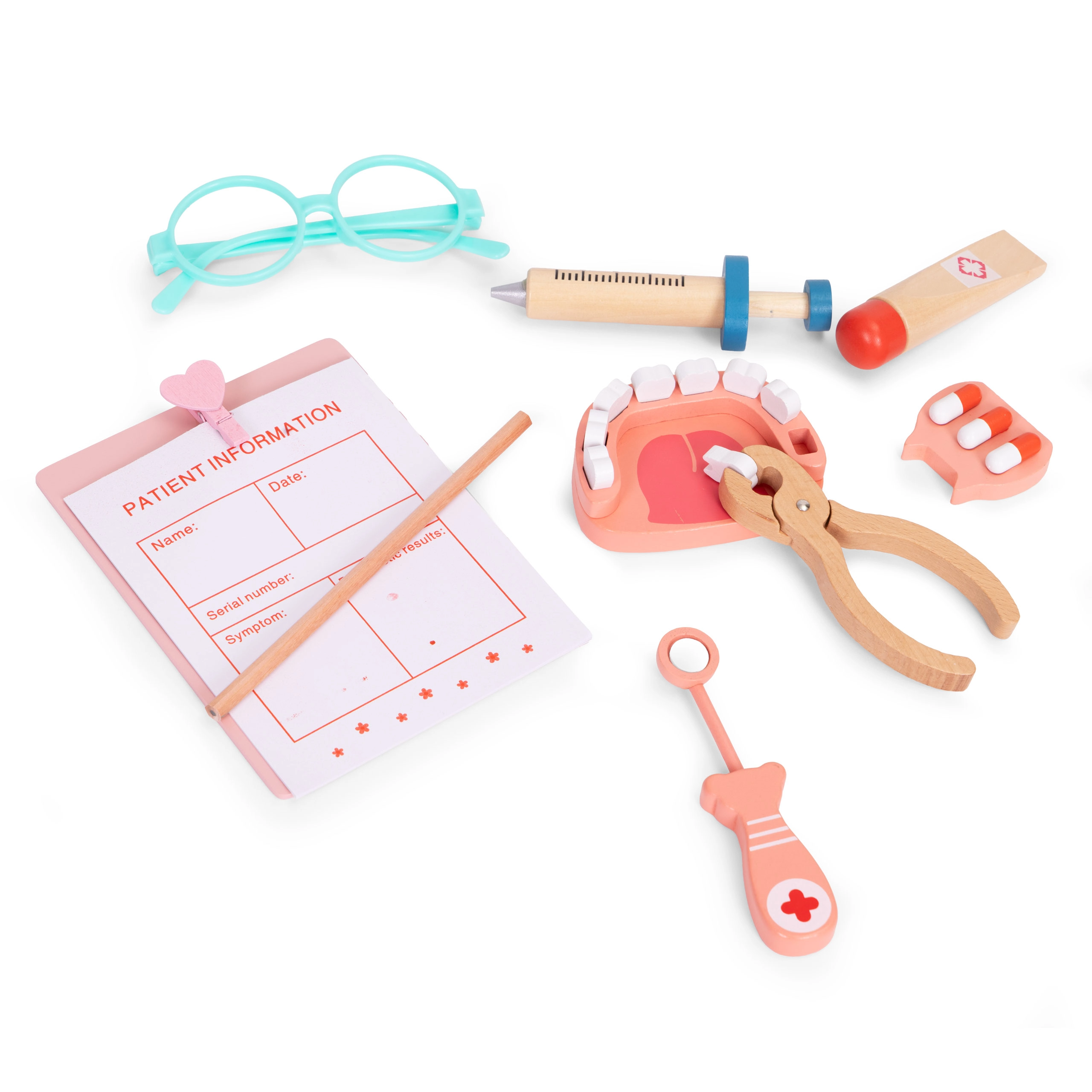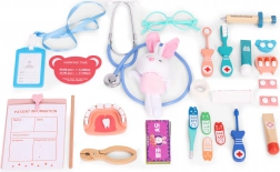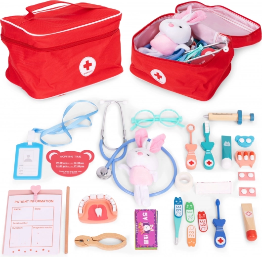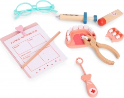 A készlet fogászati kiegészítőket is tartalmaz – protézist kivehető fogacskákkal, fogászati tükröt és fogkefét, így kiváló az szájhigiénia alapelveinek megismertetésére. Minden a praktikus textil táskában kap helyet cipzárral, amely megkönnyíti a hordozást és a rend megtartását.