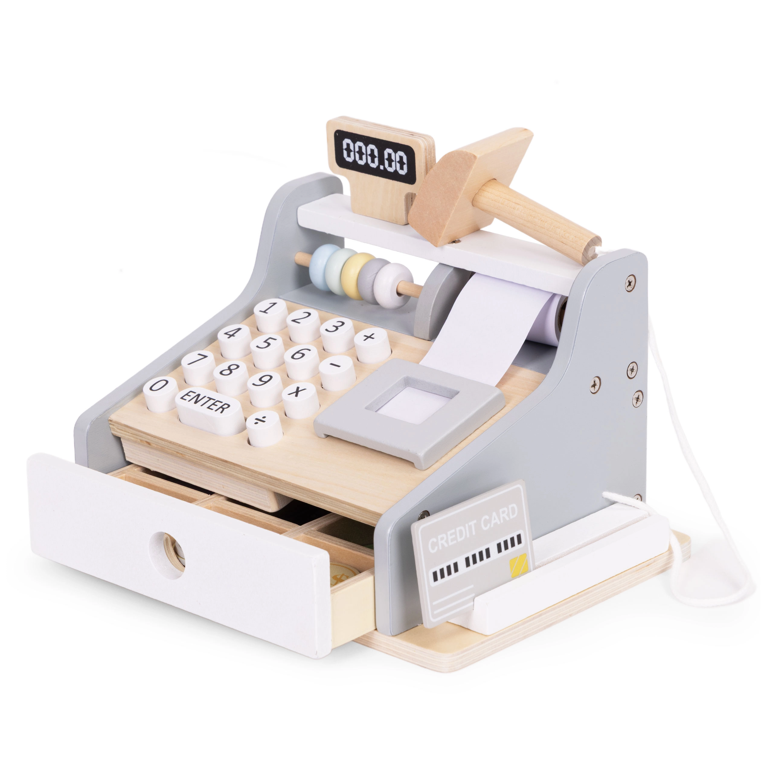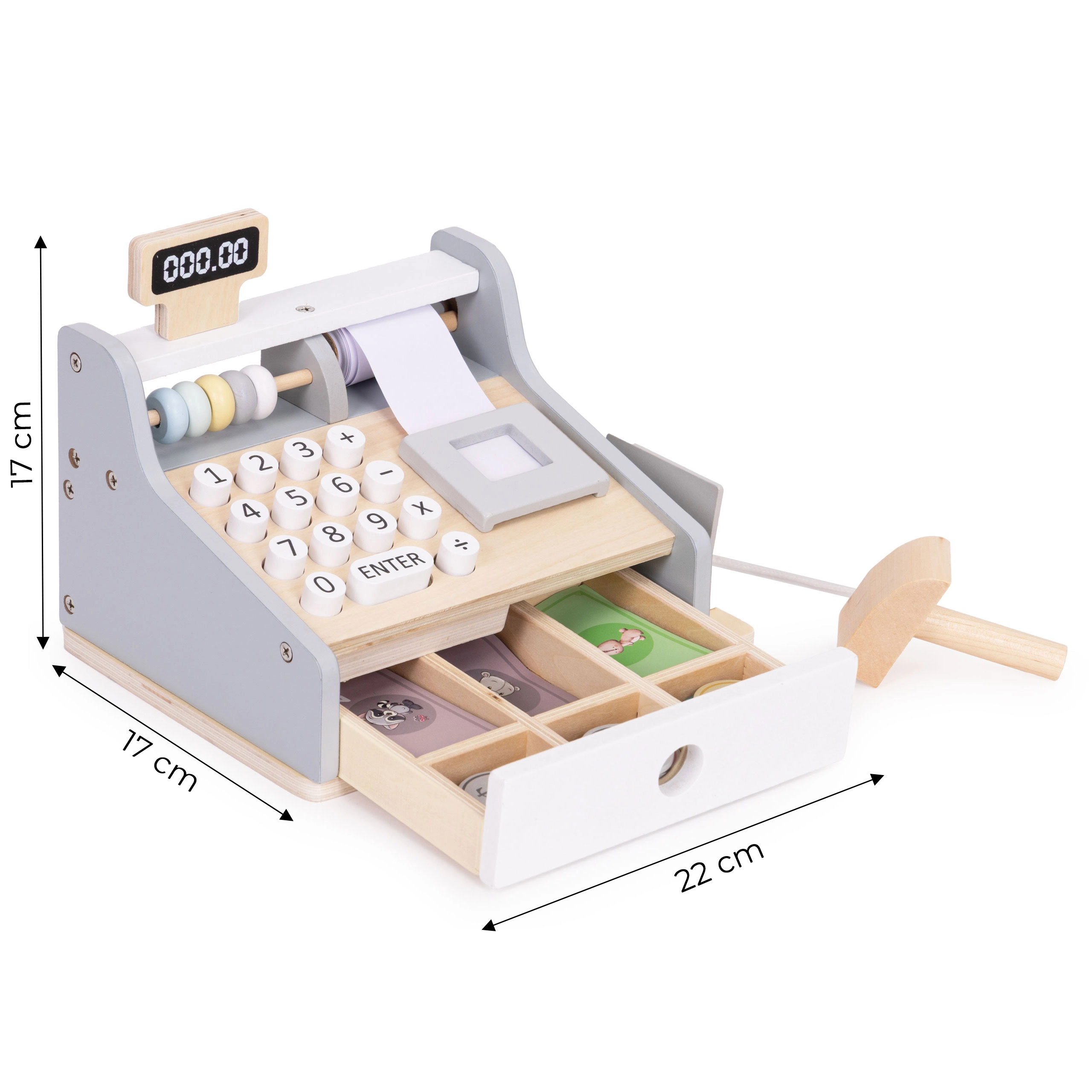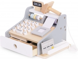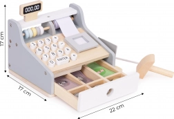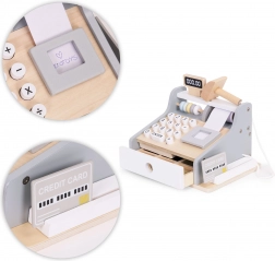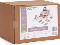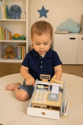 Az ECOTOYS gyerek pénztárgép kellemes natúr és szürke színekben mindent tartalmaz, amire a kis eladóknak szükségük van: számbillentyűzet, kijelző, szkenner, fizetési terminál kártyával, valamint kihúzható kasszafiók bankjegyeknek és érméknek. A tartós, lekerekített sarkú fa kivitel biztonságos játékélményt nyújt.