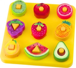 Ez az oktató kirakó gyümölcsmotívummal ötvözi a szórakozást a tanulással. A 20 × 20 cm-es alapon a gyerekek színes, geometrikus formájú elemeket párosítanak a megfelelő nyílásokhoz, így természetes módon sajátítják el a színek, formák és gyümölcsök felismerését. A csomag része egy fűzőhernyó is, amely tovább erősíti a finommotorikát és a koncentrációt.