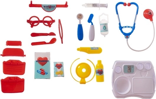 - Műanyag orvosi készlet különféle eszközökkel (pl. sztetoszkóp, injekció, hőmérő, szemüveg, gyógyszeres fiolák)