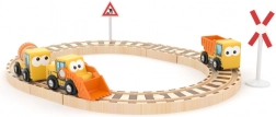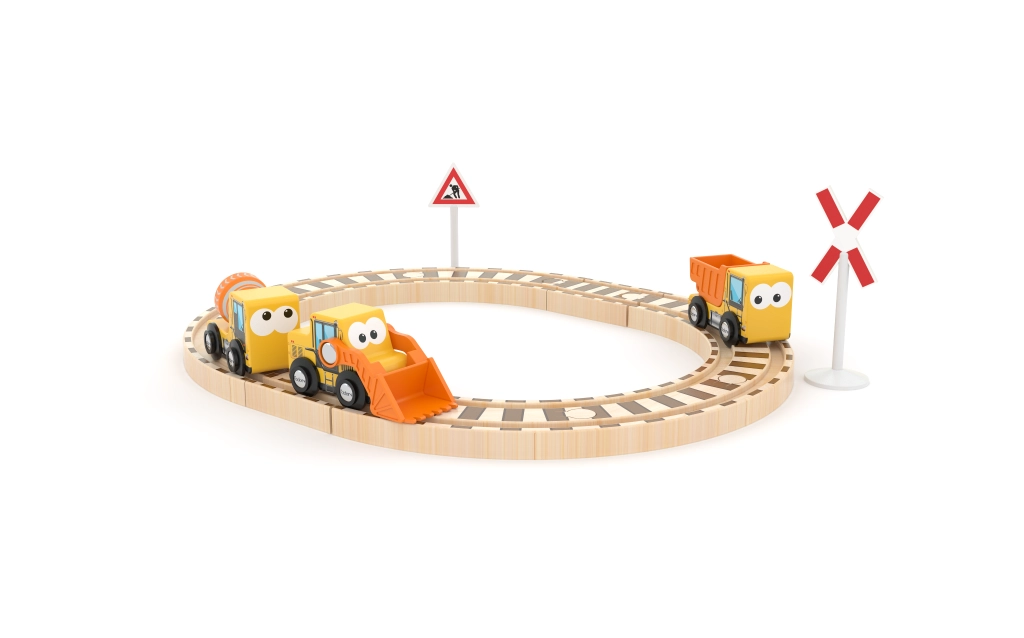 Fedezze fel a szórakoztató fa játékkészletet vasúti körpályával és építőgépekkel, amely fejleszti a fantáziát, a finommotorikát és a kreatív játékot. Környezetbarát, fenntartható forrásból származó fából készült, vegyszerek nélkül. Ideális 18 hónapos kortól.