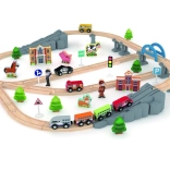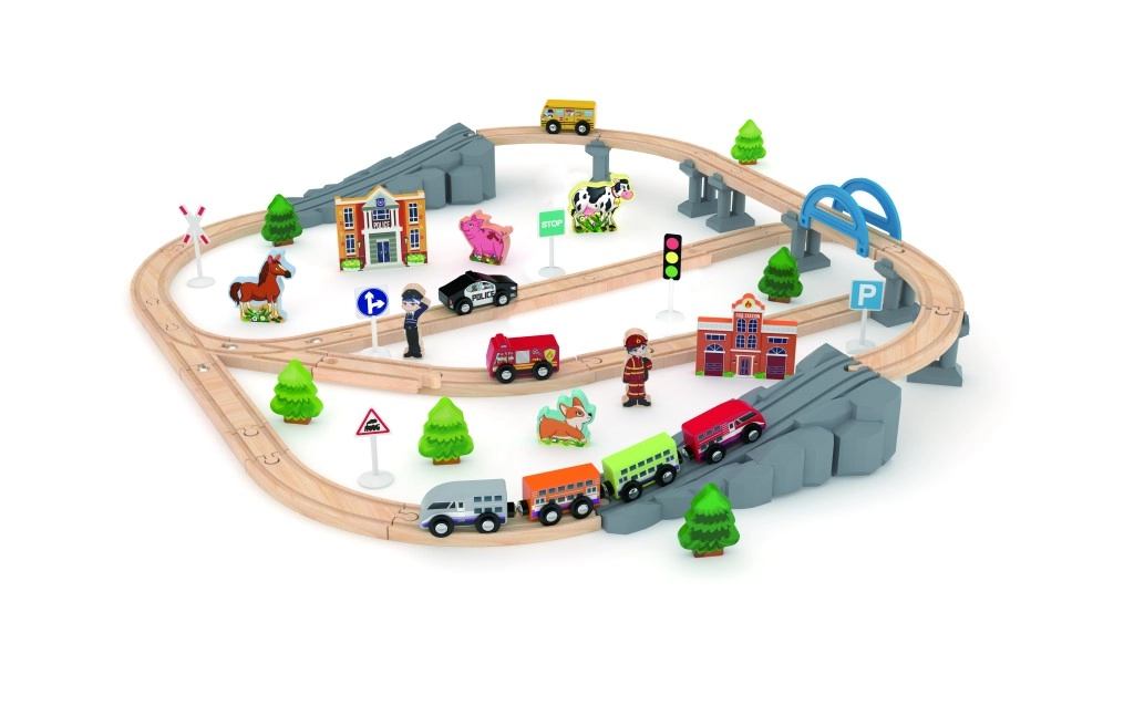 Fedezze fel a vasutak varázsát ezzel a minőségi, fából készült vonatpályával híddal és gazdag kiegészítőkkel. A készlet könnyen összekapcsolható síneket, mozdonyt és vagonokat, valamint számos figurát és állatkát kínál a végtelen játékforgatókönyvekhez. Tartós, természetes fából készült, gyermekbarát és ideális a kreativitás, logika és finommotorika fejlesztéséhez.