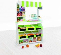 Stílusos fa játékbolt szett kis eladóknak, amely fejleszti a kommunikációs készségeket, a finommotorikát és a logikus gondolkodást. Minőségi, természetes fából készült, biztonságos és környezetbarát. Nagyobb méreteinek köszönhetően kiválóan alkalmas több gyermek közös játékára is.