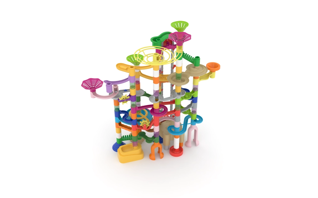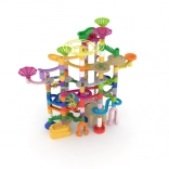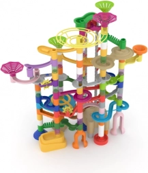 Ez a nagy golyópálya változatos elemeket kínál magas tornyok, dinamikus lejtők és mókás alagutak építéséhez. A könnyen kombinálható szegmenseknek köszönhetően a gyerekek türelmet, kreativitást és műszaki gondolkodást gyakorolnak, miközben figyelik, ahogy a golyók lendületesen végigsuhannak a kész pályán.