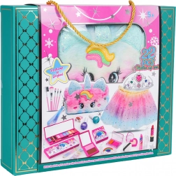 Kényeztesd a kis divatdiktátort egy varázslatos smink- és jelmezes játék készlettel. Ez a 22 darabos szett tartalmaz biztonságos, gyerekeknek való „kozmetikumokat”, szivárványos tüll tutu szoknyát, csillogó koronát és puha, unikornisos táskát. Minden a kreatív játékhoz, fantáziához és beöltözéshez készült – könnyen tisztítható vízzel és szappannal, valamint ideális ajándék.