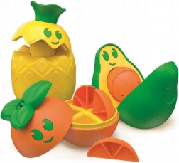 Ez a kreatív, háromféle gyümölcsöt tartalmazó készlet a kis felfedezőknek készült. Minden darab más-más játékmódot kínál: az avokádó kinyitható, belsejében kivehető golyó rejtőzik, az ananász részei egymásra rakhatók, a narancs pedig 4 szeletre bontható, amelyeket a gyerekek újra összeilleszthetnek. A különböző textúrák és formák változatos szenzoros ingereket biztosítanak.