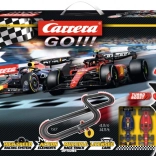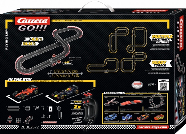 Lépj be a sebesség világába a Carrera GO!!! Flying Lap autópályával. Az összeállítás utáni 183 × 80 cm-es méretekkel és okosan megtervezett, felüljárós pályával dinamikus versenyeket kínál két Forma–1 ikon – a FERRARI SF-23 „C. Sainz” és a RED BULL RACING RB19 „M. Verstappen” – között. Az analóg rendszer mechanikus körszámlálóval és Turbo funkciós vezérlőkkel izgalmas, kerék a kerék ellen futamokat biztosít.
