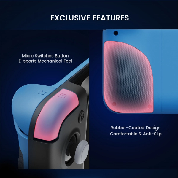 Aktiváld a Turbo funkciót késleltetés nélküli gyors akciókhoz, készíts képernyőképeket egy gombnyomással (Android/PC), és a GameSir alkalmazással (Android) finomhangold a profilokat, holttereket, A/B és X/Y átkiosztást, valamint válts az analóg és a Hair Trigger mód között. A gumírozott, ergonomikus markolatok és a Nintendo 2DS által inspirált kétszínű dizájn biztos fogást és stílust ad a hosszú játékmaratonok során.