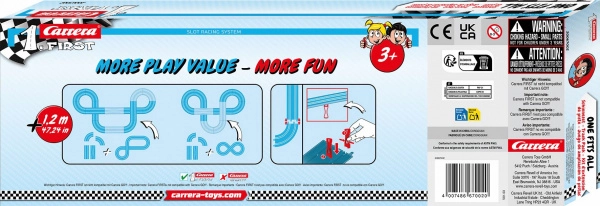 Egészítsd ki CARRERA FIRST autóversenypályádat egy új szórakozási dimenzióval a First Track Pack bővítőkészlettel. A készlet könnyű telepítést és változatosabb pálya-opciókat kínál. Tartalmaz egy egyenes elemet, pályaszűkítést és támasztékos kanyarokat a dinamikusabb vezetéshez és a hosszabb játékidőért.