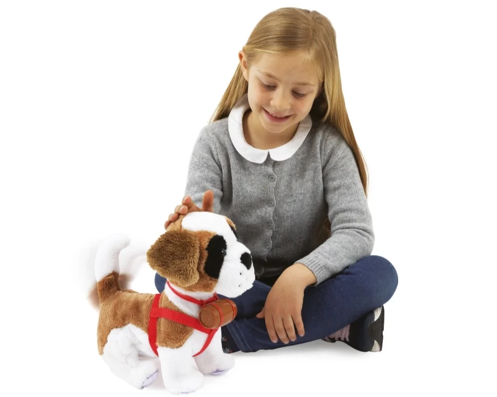 Selymes bunda, piros hám és a jellegzetes hordócskás nyakörv – mindez valóságos mentőkutya-hangulatot és rengeteg fantáziát ad a játékhoz.