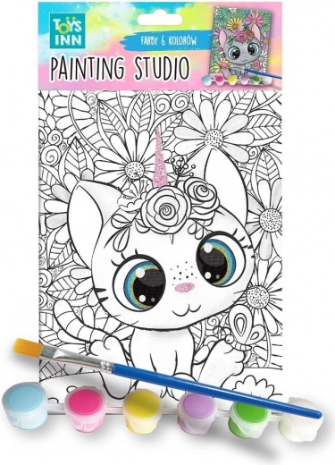 Kreatív festőkészlet gyerekeknek előre nyomtatott cica mintával, 15 × 25 cm-es vásznon. Tartalmaz ecsetet, keverőtálkát és 6 színt (fehér, sárga, rózsaszín, kék, zöld, szürke). Remek a finommotorika, a kreativitás és a türelem fejlesztésére – kezdőknek is ideális.