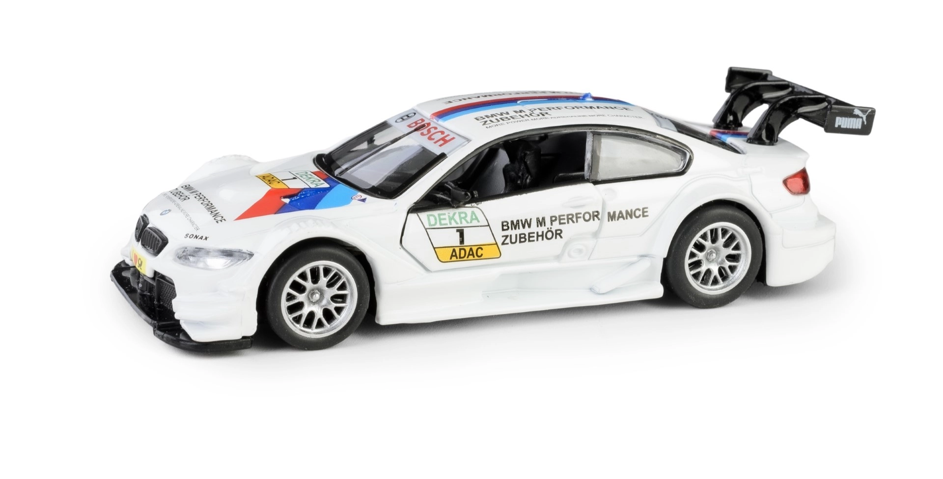 fém BMW M3 DTM modell 1:42 nyitható ajtókkal és felhúzós (pull-back) meghajtással
