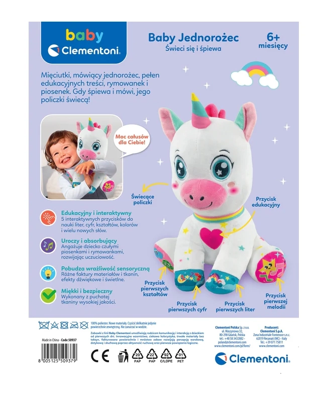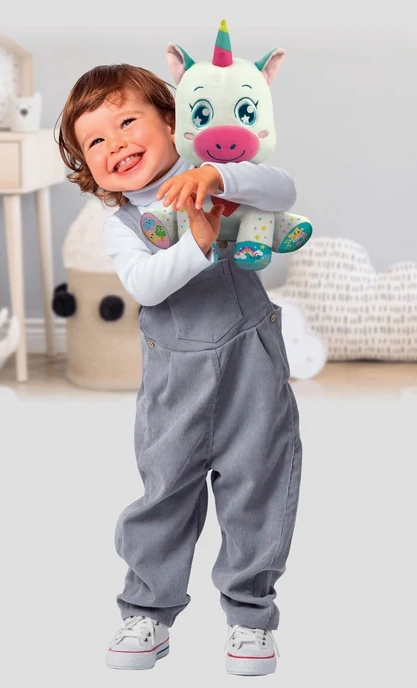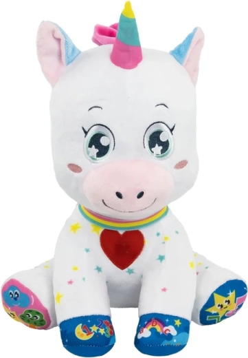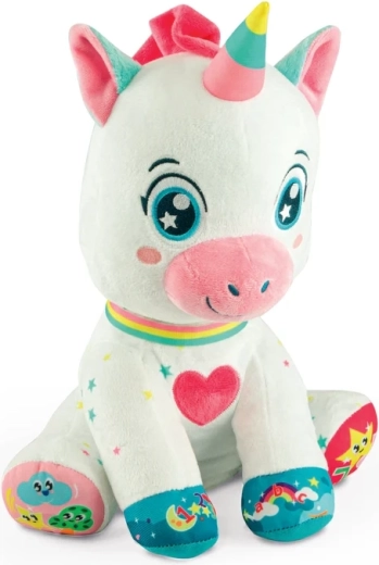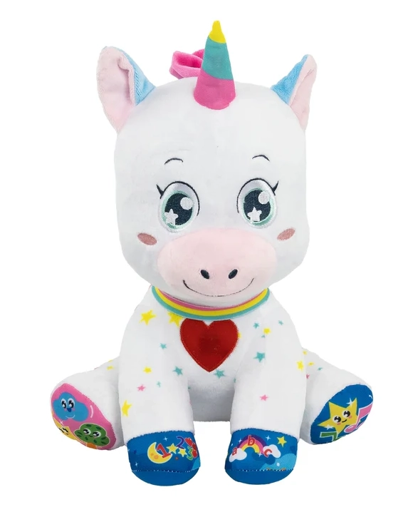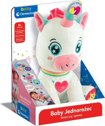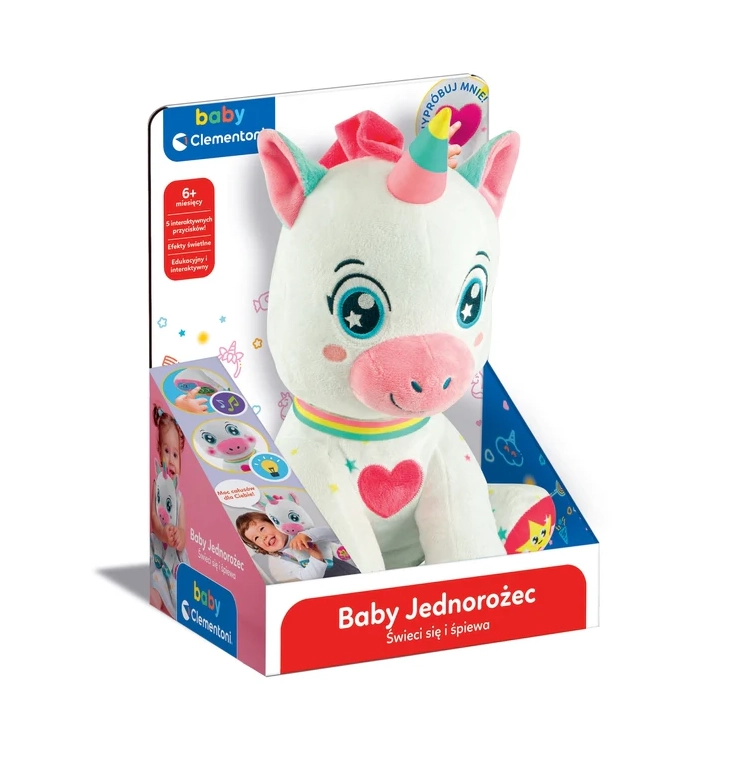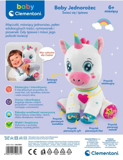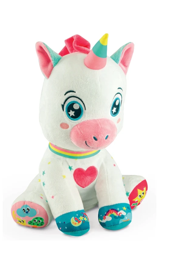 A bájos, interaktív unikornis a BABY CLEMENTONI-tól örömet szerez a 6 hónapos kortól. 5 érintésérzékeny gombbal rendelkezik a mancsokon és a szívecskén, amelyek hangokat, dalokat és mondókákat indítanak, és betűket, számokat, formákat és színeket tanítanak. Puha, nem mérgező anyagok, megvilágított pofika és világító szarv támogatják a vizuális észlelést, a finommotorikát és a szókincsfejlesztést.