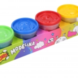 Kreatív gyurmakészlet gyerekeknek, négy darab 140 g-os tégellyel zöld, kék, piros és sárga színekben. A gyurma puha, jól formázható, és ideális a finommotorika és a kreativitás fejlesztéséhez.