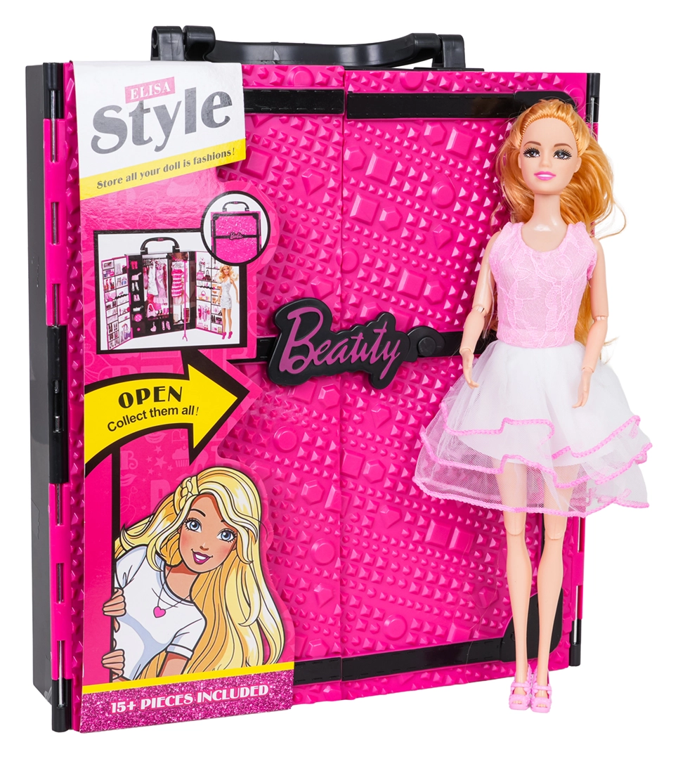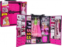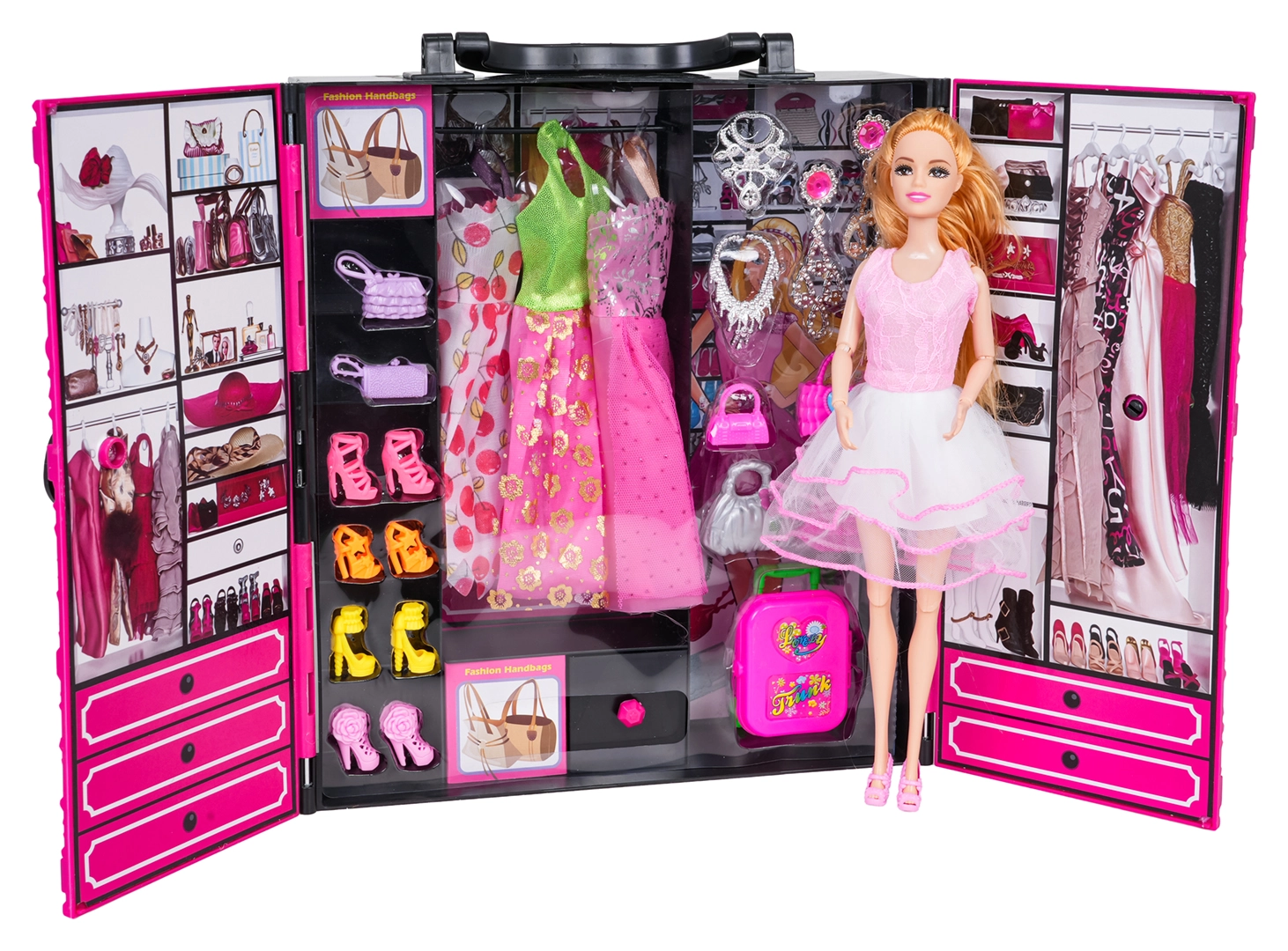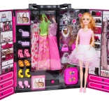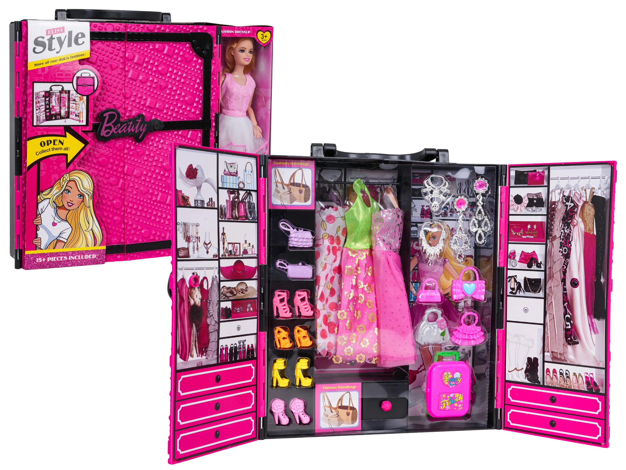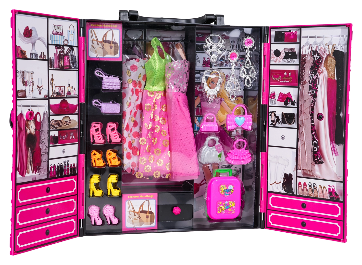 Ez a gazdagon felszerelt készlet egy nagy, hordozható ruhatárat és egy stílusos babát kombinál gyönyörű ruhákkal. Belül ruhák, magassarkú cipők, táskák, ékszerek és további kiegészítők találhatók áttekinthetően elrendezve polcokon, fiókokban és vállfákon. A gyerekek így élvezhetik az öltöztetést, a szerepjátékot, és fejleszthetik a finommotorikát.