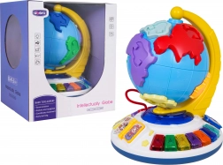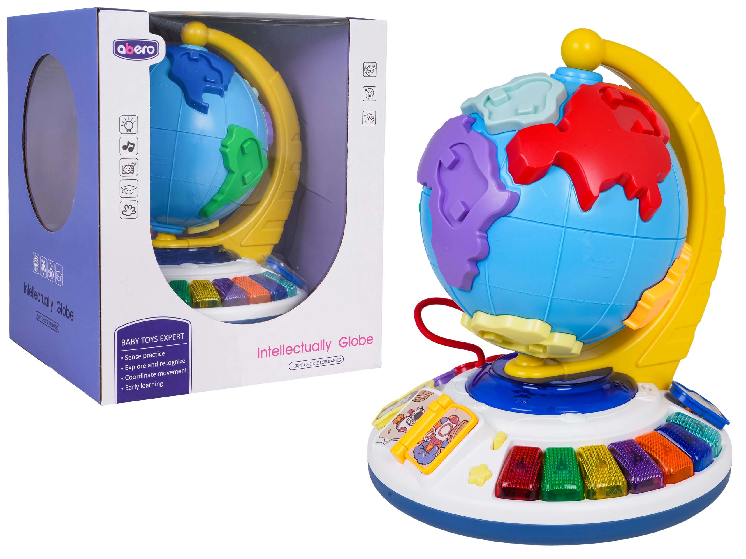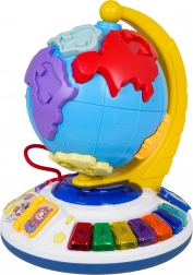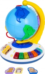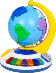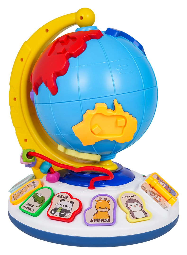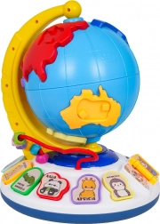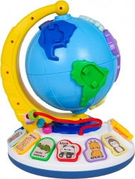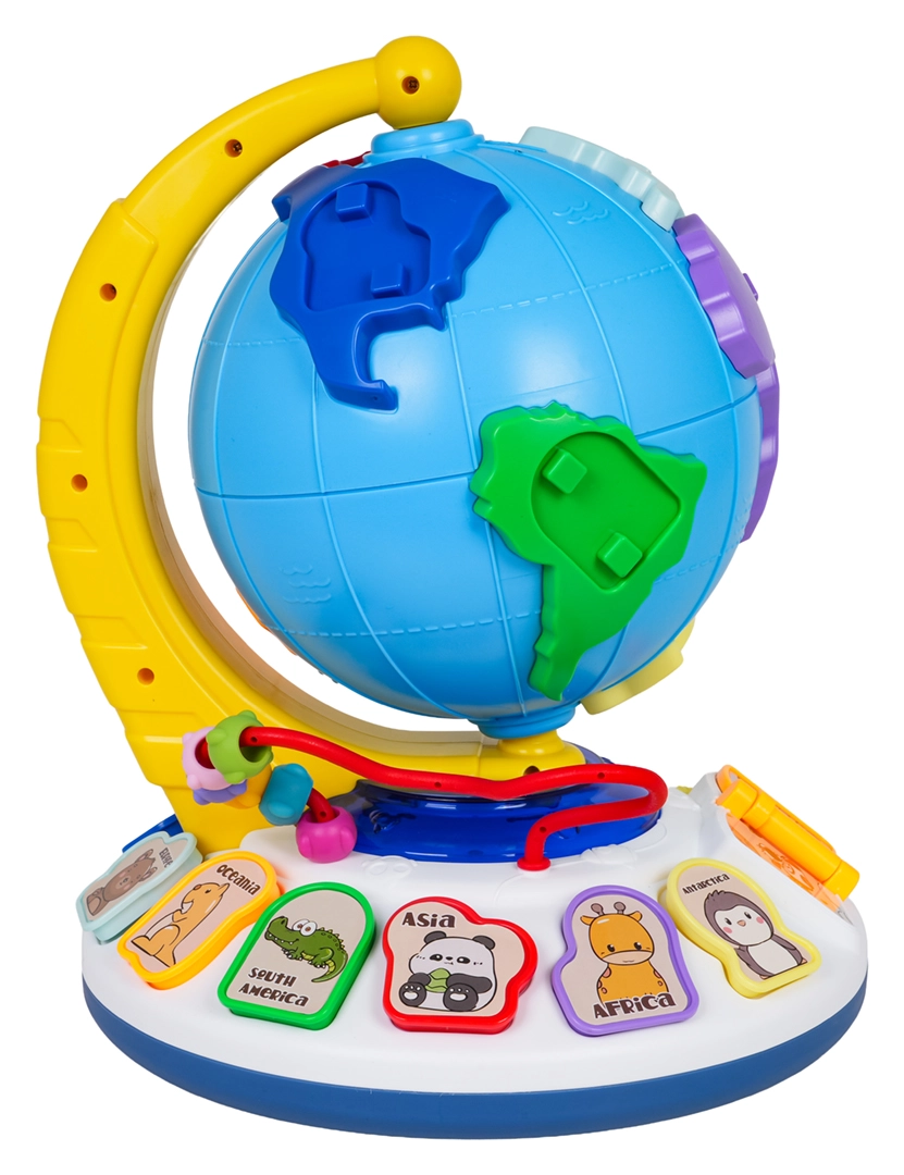 A földgömb szabadon forog a stabil talapzaton. A lapozható könyvecske dallamokat indít, a gyöngypálya pedig fejleszti a finommotorikát.
