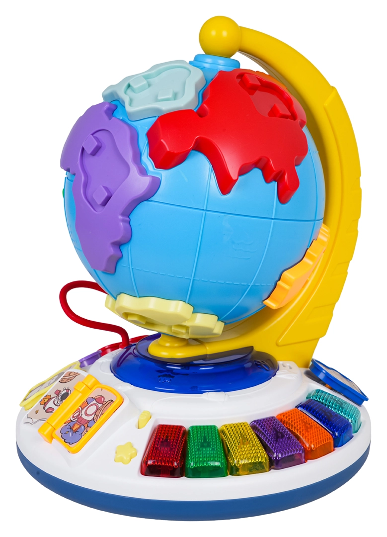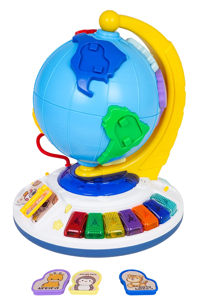 A stabil talapzaton világító zongora színes billentyűkkel, dallamokat indító lapozható könyvecske és finommotorikát fejlesztő gyöngypálya található. Az állatos gombostű kiválasztott helyre illesztésekor megszólal a kontinens neve, az állat neve és jellegzetes hangja – a tanulás természetes módon, játékon keresztül történik.