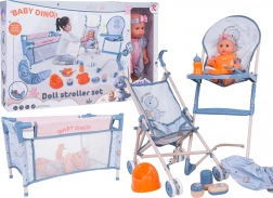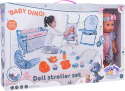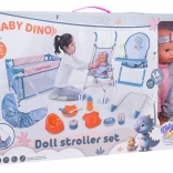 Ez a mega BABY DINO készlet rengeteg lehetőséget kínál a gyerekeknek kreatív és valósághű gondozós játékokra. A babának mozgatható karjai és lábai vannak, színes rugdalózóba és fejpántba van öltöztetve, tud inni az üvegből és „pisilni” a bilibe. A könnyű babakocsinak, az utazóágynak és az etetőszéknek köszönhetően a gyerekek etethetik, tologathatják és altathatják a babát.