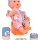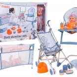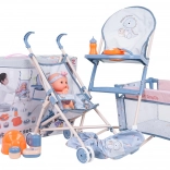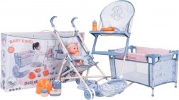 Fedezze fel a gazdagon felszerelt anyás-babás játékkészletet a bájos BABY DINO babával és 14 darab kiegészítővel. A csomagban talál babakocsit, etetőszéket, utazóágyat, bilit, cumisüveget és etetéshez szükséges kiegészítőket. A biztonságos anyagoknak, a élénk színeknek és annak köszönhetően, hogy a baba itatható és bilire szoktató, a szett ideális 3 éves kortól.