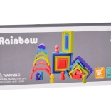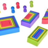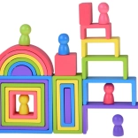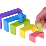 Ez a színes fa készlet a Montessori módszer által inspirált nyitott játékot kínál. A gyerekek tornyokat, hidakat, házikókat és absztrakt szerkezeteket építhetnek, sorba rendezhetik az elemeket méret és szín szerint, vagy egymásba illeszthetik és rétegezhetik azokat. A játék fejleszti a kreativitást, a térbeli képzelőerőt és a logikus gondolkodást.
