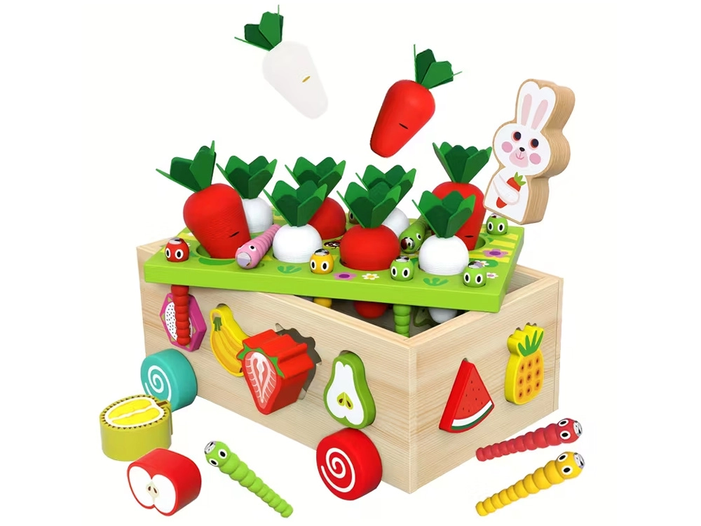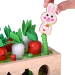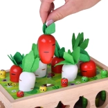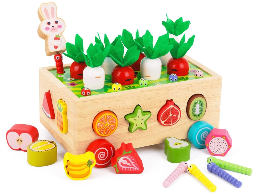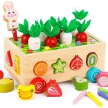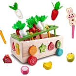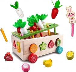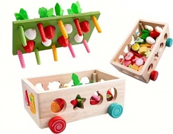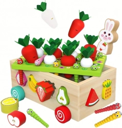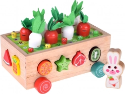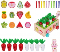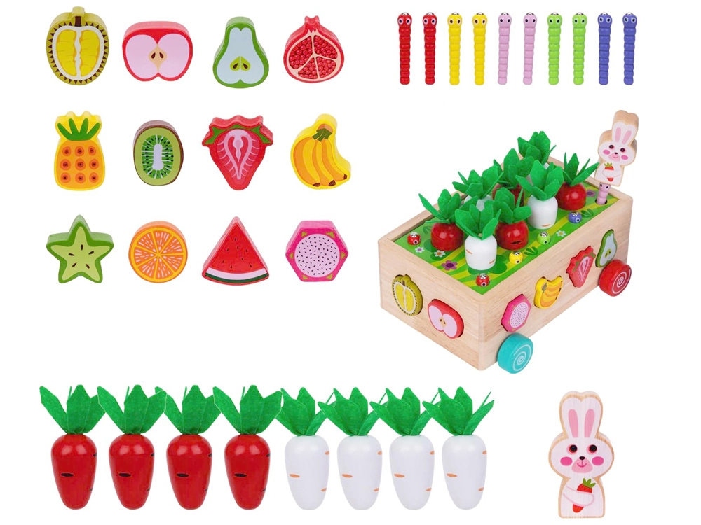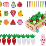Ez a többfunkciós, Montessori szellemű fa szett sokféle tevékenységet kínál: filc lombos répák kihúzása és „ültetése”, mágneses kukacfogás a nyuszi figurával, valamint klasszikus színes gyümölcsformák válogatása a megfelelő nyílásokba. Masszív kivitelének és sima éleinek köszönhetően a játék biztonságos és tartós a mindennapi használathoz.