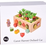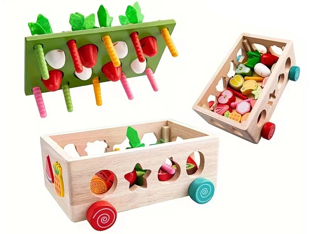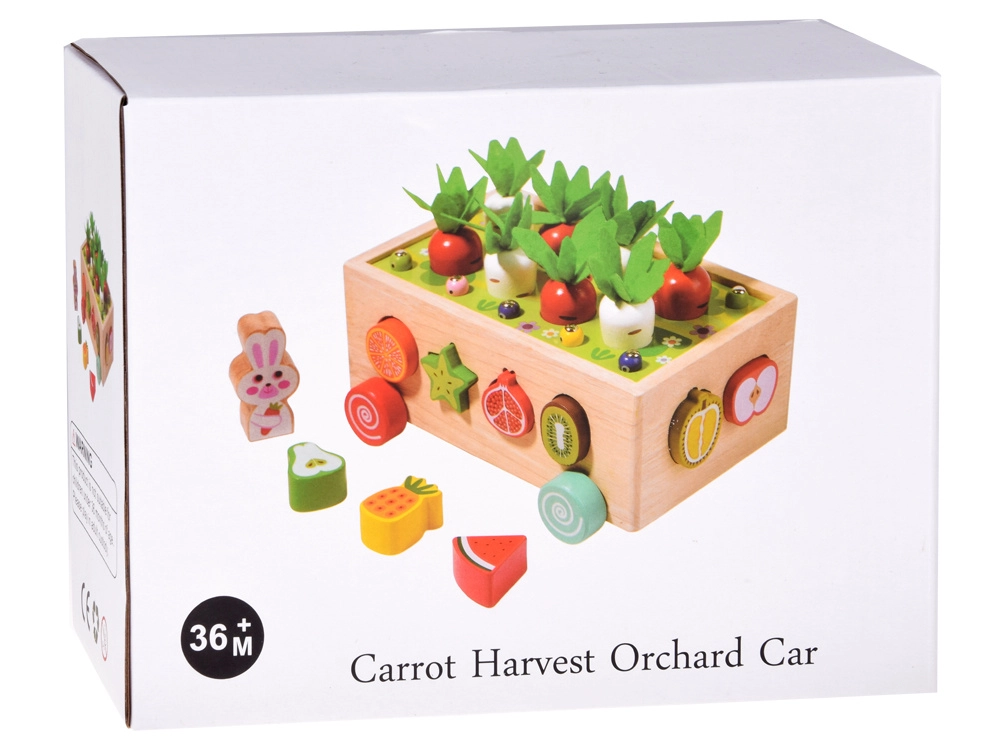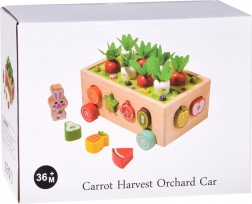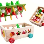 A kocsika tolható és húzható, így a nyugodt játékok mellett az egészséges mozgást is támogatja. A gyerekek természetes módon fejlesztik a logikus gondolkodást, a koncentrációt, a térbeli képzelőerőt és a önállóságot. A színes gyümölcsök (banán, narancs, dinnye, kivi, sárkánygyümölcs, gránátalma, körte, alma, karambola, kiwano, ananász, eper) bővítik a szókincset és a formaismeretet.