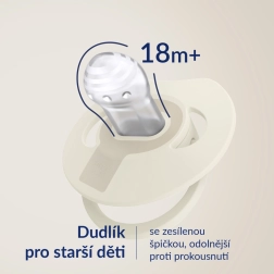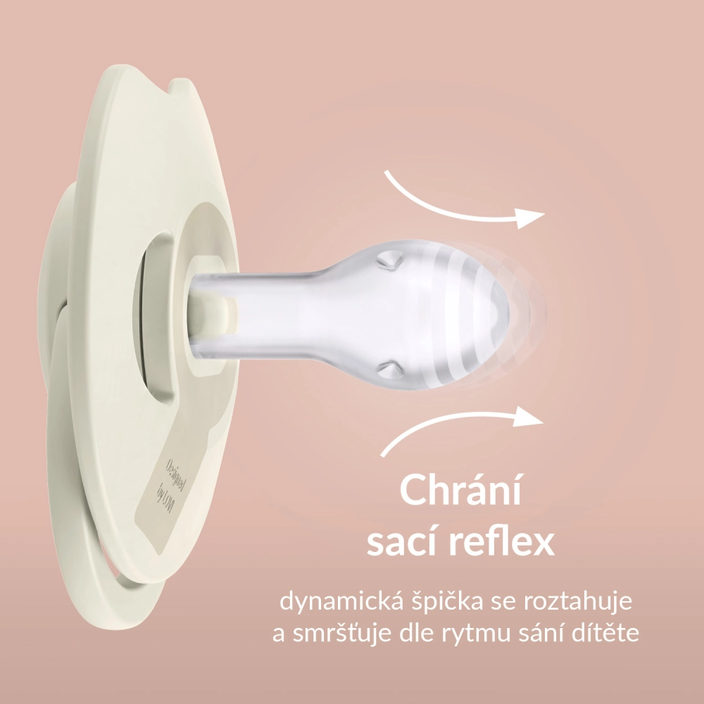 A könnyű és ergonomikus pajzs profilozása a szabad orrlégzést szolgálja, és szellőzőnyílásokkal rendelkezik a jobb levegőáramlásért, ezáltal minimalizálja a bőrirritációt. A lapított cumivég és a vékony nyak lehetővé teszi a babának, hogy szabadon zárja a száját, valamint helyesen dolgozzon az ínnyel és a nyelvvel, ami csökkenti a malokklúzió kockázatát. A tartós szilikon nem deformálódik a szájban, és hipoallergén.