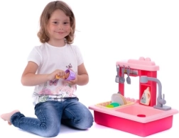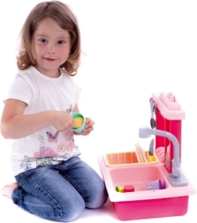 Rózsaszín gyerek mosogató elemmel működő csappal és kiegészítőkkel