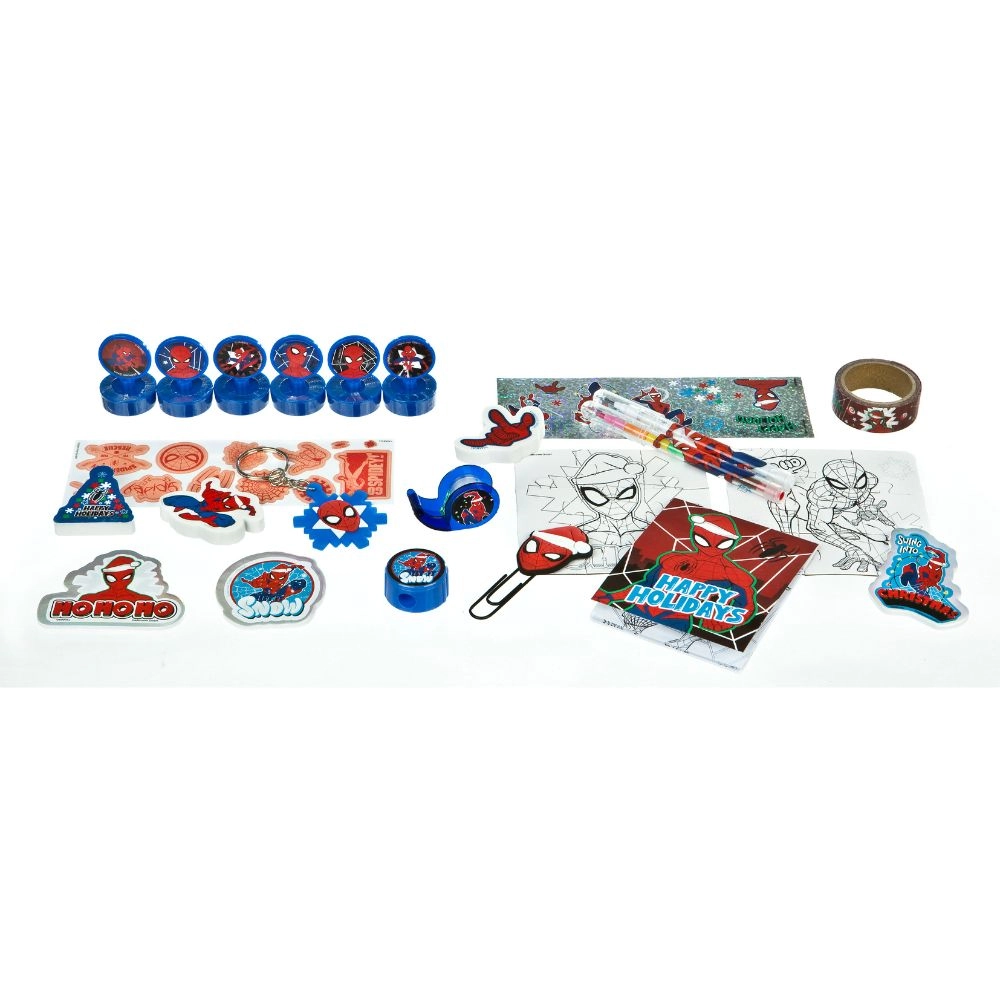 Belül olyan apróságok várnak, mint mini pecsétek, kirakó, kulcstartó, adagolós ragasztószalag, lézeres matricák, mini grafitceruza, mini színesceruza, rázós matricák, gemkapcsok, jegyzettömb, formára vágott radírok és washi szalag. Minden ablak egy kis kaland, amely örömet okoz minden SPIDER-MAN rajongónak.
