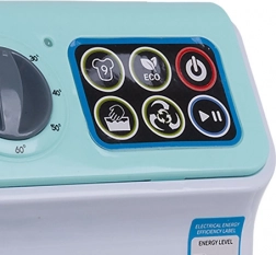 A gyerekek imádni fogják a gombokkal ellátott panelt, a forgatható hőfokválasztót és a start/stop funkciót. A kezelése intuitív, és egy igazi mosógépet idéz.