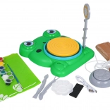 A játékos, békás fazekaskorong lábpedállal biztonságos és szórakoztató módot kínál a gyerekeknek a kerámia alapjainak kipróbálására. A korong két sebességgel (lassú/gyors) forog, így a gyerekek könnyen saját tempójukhoz igazíthatják a munkát. A kész edényeket a mellékelt festékekkel kifesthetik és büszkén kiállíthatják.